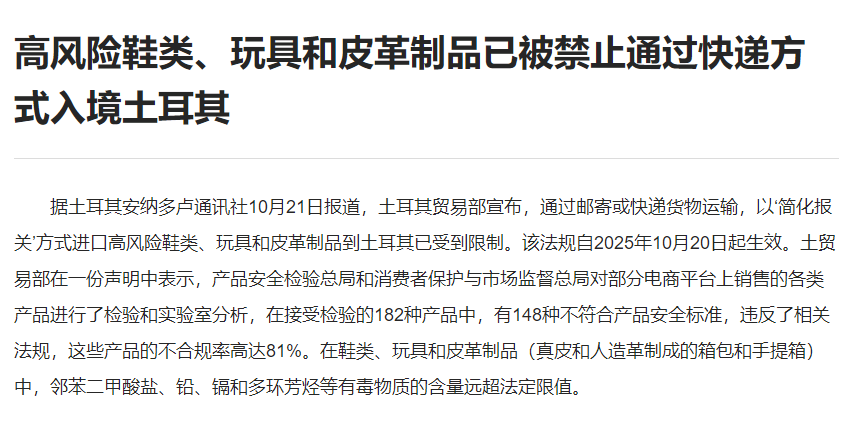 最新消息称,土耳其贸易部上周二公布了对从部分中国零售电商平台进口的部分商品实施的新限制,通过邮寄或快递货物运输,以“简化报关”方式进口高风险鞋类、玩具和皮革制品到土耳其已被禁止。该法规自2025年10月20日起生效。